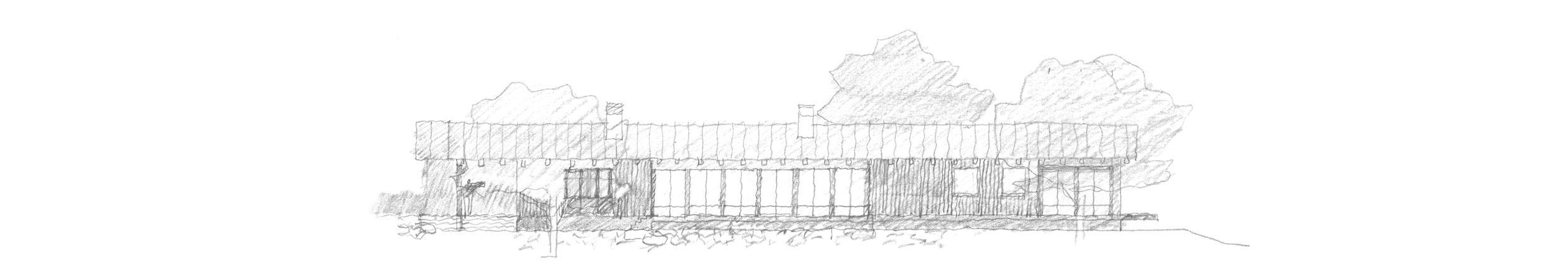 Two parallel building forms standing seam metal roofs surrounded by oak trees.